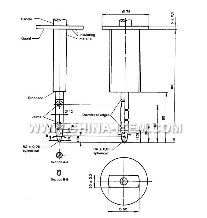 1. Jointed Finger Probe: Precision probe which follows IEC specifications and meets the newest requirements. The design features a plan simulator to prevent misuse and a restricted joint movement which simulates human finger movement. This model meets CSA, IEC, UL and other industry requirements.